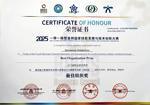 近日,2025年“一带一路”暨金砖国家技能发展与技术创新大赛之第四届大数据财务应用与管理会计决策赛项全国总决赛圆满落幕。我院数字经济与管理学院大数据与会计专业学生王梦蝶、陈珂帆、谭湘宁、周永鑫,在教师杨杰、吕帆的精心指导下,凭借扎实的专业能力和良好的团队协作,从全国1950余支参赛队伍中脱颖而出,以北区第十九名晋级全国总决赛,并最终以全国第九名的优异成绩荣获一等奖。学院同时获评全国“最佳组织奖”,展现出在大数据财务与管理会计融合育人方面的扎实成效。