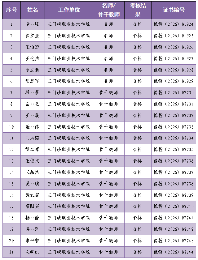 近日,河南省教育厅 河南省人力资源和社会保障厅发布了《2023年河南省职业院校省级名师和省级骨干教师培育期满考核结果的通知》(教职成〔2026〕20号),学院辛峰、郭立业等6名省级名师、段蕾、岳星等15名省级骨干教师全部通过考核,充分彰显了学院师资队伍建设的显著成效。