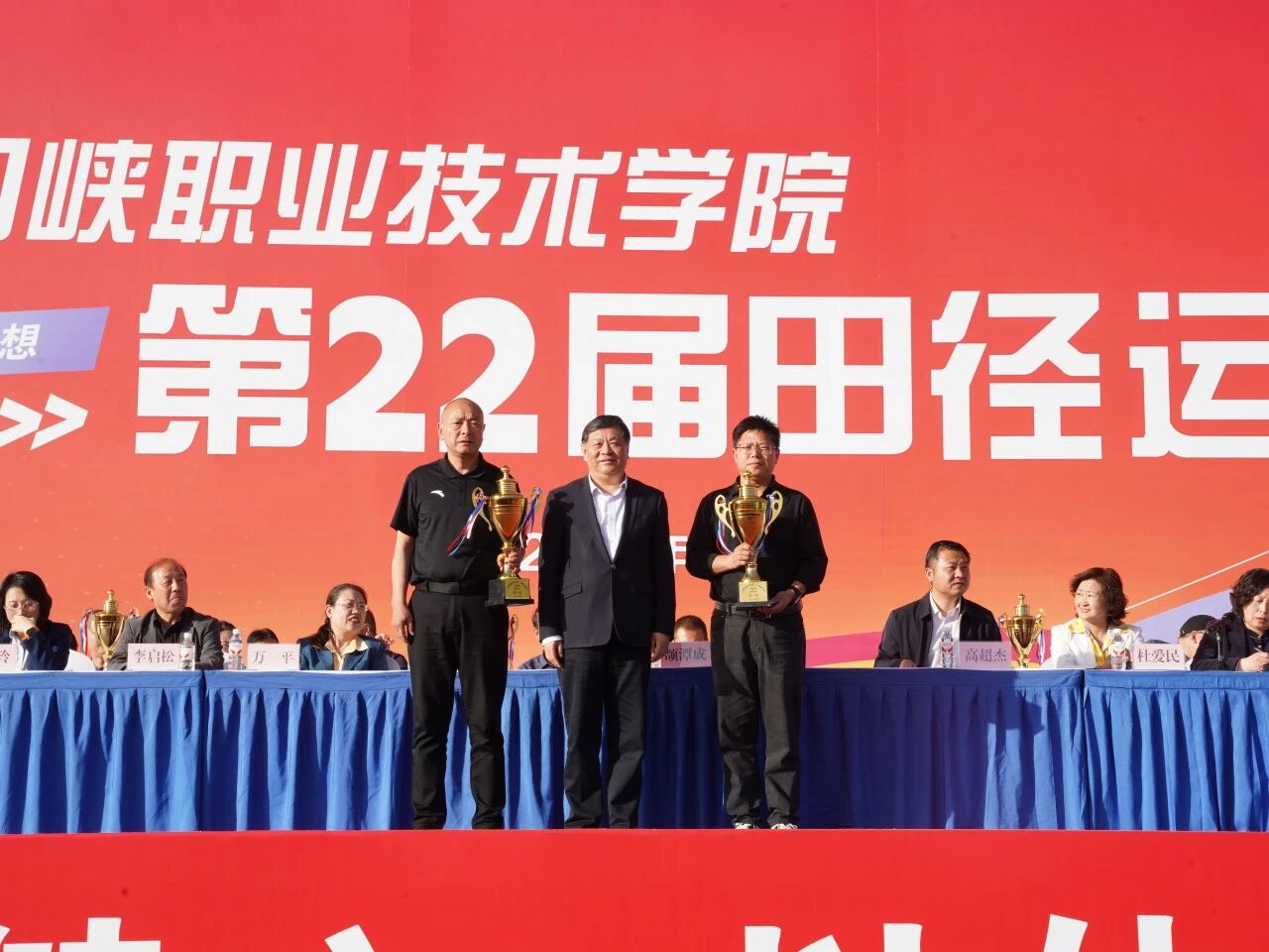 党委副书记高超杰致闭幕词,代表学院向所有辛勤付出的工作人员表示感谢,向取得优异成绩的学院和运动员表示祝贺。党委委员、工会主席、副院长杜爱民宣读了《三门峡职业技术学院第二十二届田径运动会优秀集体名单》。