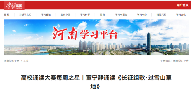 近日,第七届河南省高校“阅见新时代・声传家国情”主题诵读大赛传来喜讯,学院学子在比赛中表现优异,获评“每周之星”。其诵读作品《长征组歌·过雪山草地》成功入选,登上“学习强国”平台展播,收获广泛关注与好评。