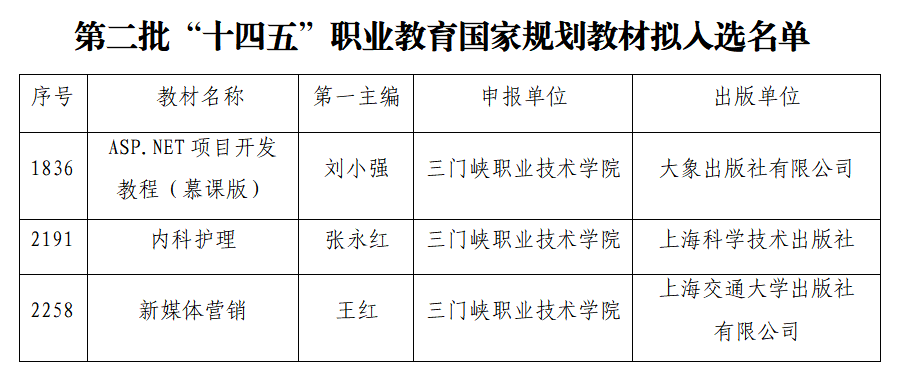 近日,教育部正式公示第二批“十四五”职业教育国家规划教材遴选结果,我院《ASP.NET项目开发教程(慕课版)》《内科护理》《新媒体营销》3部教材成功入选。这是我院在教材建设领域取得的重大突破,充分体现了学院在深化教育教学改革和提升人才培养质量方面的新成效。