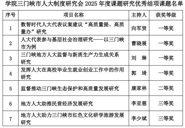 本次获奖课题紧扣时代主题、立足三门峡发展实际,兼具理论深度与实践价值,为地方人大工作创新与经济社会高质量发展提供了有力学理支撑与决策参考。其中,一等奖课题聚焦数智时代人大履职、代表作用发挥、新质生产力培育、高校毕业生就业等关键议题;二等奖课题围绕人大监督、生态保护等展开系统研究;三等奖课题聚焦民营经济、红色文旅等领域,体现了应用型高校科研对接地方、服务发展的鲜明导向。